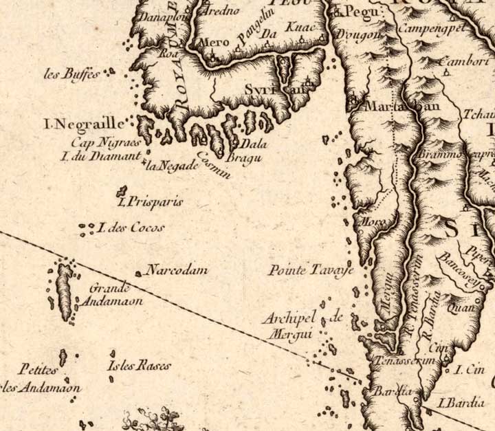 Négrailles, ou comme l'appellent les Portugais Negraes, est une île inhabitée, assez grande, située sur les confins du Pégou et de l'Aracan. On y trouve des éléphants, des tigres, des cerfs et une si grande quantité de buffles qu'ils viennent en troupe se baigner au bord de la mer. Je ne doute pas que les peuples voisins n'eussent cultivé cette île, dont le terroir paraît fertile et arrosé de rivières si elle était poissonneuse, la plupart des Indiens ne vivant que de la pêche, et si l'air était était sain et moins marécageux. À cela près, il est sûr qu'on ne voit guère dans les Indes de poste plus commode ni plus avantageux pour un grand établissement. Les vaisseaux qui vont de Bengale à Mergui, à Achem ou [28 - 151v°] au détroit de Malacca, ou ceux qui en viennent pour aller à Bengale, doivent nécessairement la venir reconnaître pour éviter divers écueils où ils tomberaient immanquablement s'ils faisaient une autre route. Negrailles avec une autre petite île forment vers le sud un port assez sûr et assez grand, dont l'entrée est dangereuse et difficile à ceux qui ne la connaissent pas. On en [ ] sur la carte le plan exact avec les sondes et une petite description qui ne sera pas inutile à ceux qui seront obligés d'y passer (21).