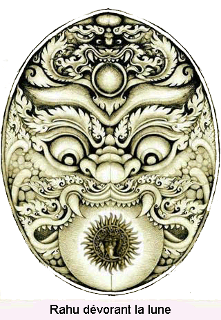 L'âge du soleil et de la lune atteint quatre-vingt-dix millions d'années. Phra-athitพระอาทิตย์ (le soleil) et Phra-chanพระจันทร์ (la lune) sont deux frères qui ont un frère cadet appelé Rahúอสุรินทราหู. Dans sa génération passée Phra-athit donnait l'aumône aux talapoins dans un vase d'or, Phra-chan dans un vase d'argent, et Rahú dans un vase de bois noir ; c'est pourquoi Rahú prit naissance dans la région des géants au-dessous du mont Meru ; il est d'une taille de quatre mille huit cents lieues ; sa bouche énorme a une profondeur de trois cents lieues. Ayant été un jour frappé par ses frères, il en conserve encore un esprit de vengeance, et de temps en temps il sort de la région des géants et ouvre sa bouche énorme, attendant le soleil ou la lune pour dévorer leurs palais lorsqu'ils passeront ; mais lorsqu'il a saisi le soleil ou la lune, il ne peut pas les retenir longtemps à cause de la rapidité de leur course ; et s'il ne les lâchait pas, les palais briseraient la tête du monstre. C'est ainsi qu'on explique les éclipses.