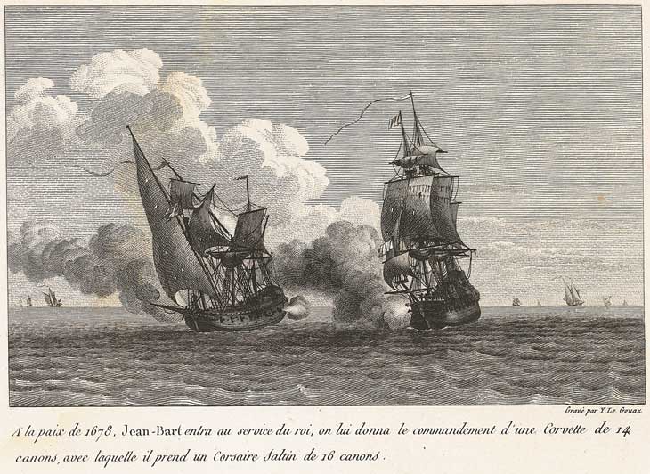 À la paix de 1678, Jean Bart entra au service du roi, on lui donna le commandement d'une corvette de 14 canons avec laquelle il prend un corsaire saltin de 16 canons. ⇑