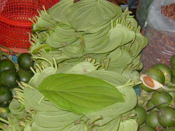 Noix de bétel et feuilles sur un marché thaï. ⇑