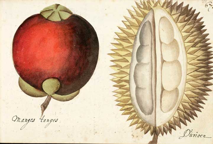Je commencerai par le plus estimé, qui est le durion (1), ce fruit est de la grosseur et de la figure d'un melon ordinaire. L'écorce en est dure et raboteuse, il croît au haut du tronc de l'arbre, au-dessous des branches, et parce qu'il serait difficile de l'ouvrir à cause de la dureté de son écorce, lorsqu'il est mûr, la nature a voulu qu'il s'ouvrît de lui-même par le bas en trois ou quatre endroits, on achève de le rompre avec force. On trouve dans ce fruit des morceaux d'une certaine chair tendre et délicate, enfermée en de petites cellules, cette chair égale la neige en blancheur et surpasse en la délicatesse de son goût tout ce que nous avons de meilleur en Europe, et aucun de nos fruits n'en approche. Chaque durion porte cinq, six, sept et huit de ces morceaux de chair blanche, la figure est comme celle d'une amande verte, mais quatre ou cinq fois plus grosse. Ce qui est de singulier en ce fruit merveilleux est que son odeur est fort désagréable et même insupportable d'abord qu'on la sent, ressemblant à celle d'une pomme pourrie. Ce fruit est extrêmement chaud, les Européens qui en mangent avec excès sont contraints, pour modérer l'ardeur qu'il cause, d'aller incontinent se baigner.