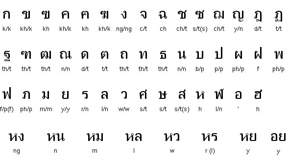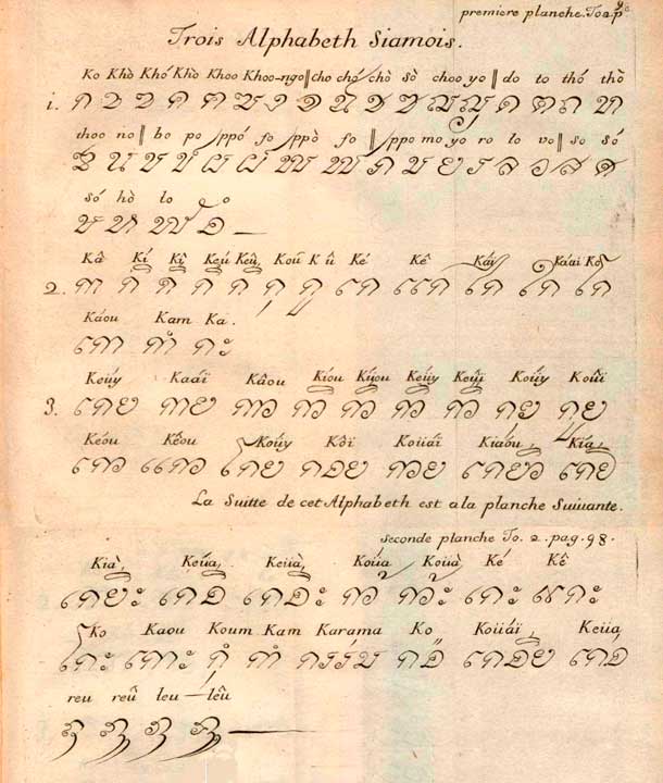 5 - C'est le roi Ramkhamhaeng (พ่อขุนรามคำแหงมหาราช) qui, à la fin du XIIIe siècle, élabora les premiers éléments de l'écriture siamoise, à partir de l'écriture khmère. Dans son Journal du 28 avril 1685, l'abbé de Choisy indique que l'alphabet siamois comporte trente-trois lettres, pas de conjugaison et beaucoup d'adverbe. Tavernier confirme ce chiffre : Les Siamois ont trente-trois lettres dans leurs alphabets. Ils écrivent comme nous autres de la main gauche à la droite, tout au contraire des peuple du Japon, de la Chine, de la Cochinchine, et de Tonkin, qui conduisent leur écriture de la main droite à la gauche, et depuis le haut de la page jusqu'au bas. (Voir la Relation de Jean-Baptiste Tavernier). Dans sa Relation, La Loubère dénombre pour sa part 37 lettres. L'alphabet thaï moderne comporte 44 consonnes (dont 2 aujourd'hui abandonnées).