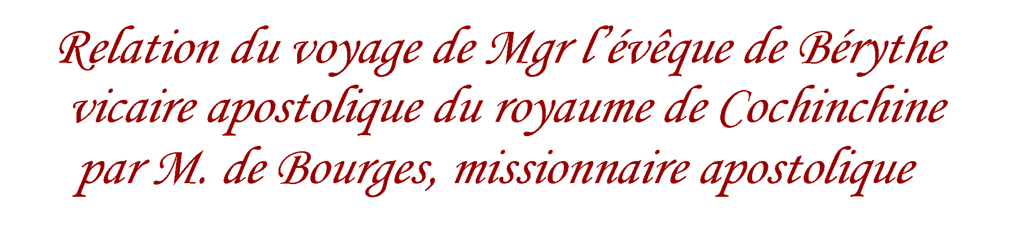 La RELATION DV VOYAGE DE MONSEIGNEVR L'EVEQUE DE BERYTE VICAIRE APOSTOLIQUE DV ROYAVME DE LA COCHINCHINE, Par la Turquie, la Perse, les Indes, &c. jusqu'au Royaume de Siam, & autres lieux. Par M. DE BOVRGES Prestres, Missionnaire Apostolique a été publiée à Paris, chez Denys Bechet, rüe S. Jacques, au Compas d'or, & à l'Escu au Soleil. en 1668, avec Privilege du Roy, & approbation.