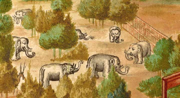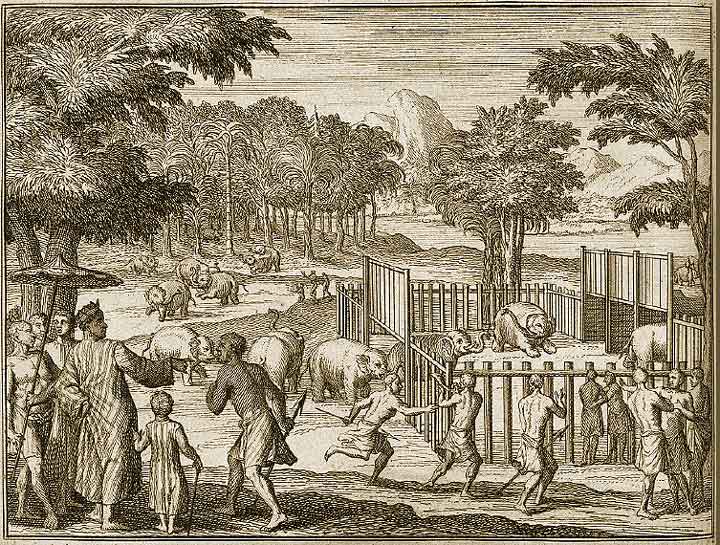 La chasse des éléphants au Siam. Gravure 1727. ⇑