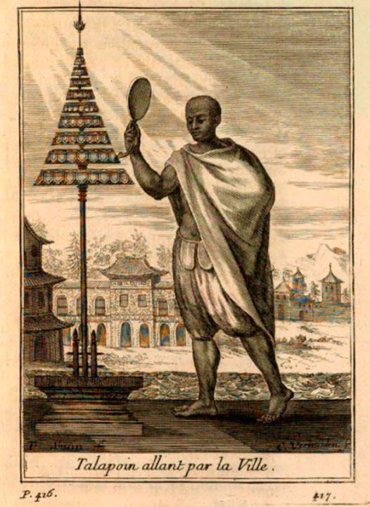 Talapoin allant par la ville. Illustration du Voyage des pères jésuites de Guy Tachard (1691).