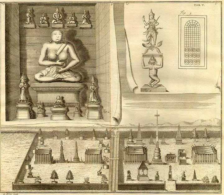 Tout ce qui a appartenu à Phra-Phu-Thi-Chau est un objet de vénération pour les Siamois. De temps en temps, le roi de Siam envoie à Ceylan un vaisseau richement orné, pour rapporter quelques reliques de ce prétendu dieu. Il n'y a pas encore trois ans que le dernier voyage a eu lieu. La caverne où il se retira, la fontaine qui en découle, l'empreinte de son pied, sont devenus un objet de pèlerinage pour les Siamois : le vestige de ce pied a environ cinq pieds en longueur, il est parsemé de pierres précieuses et couvert d'un drap de grand prix ; on a planté tout autour de petites baguettes de fer, dans lesquelles les pèlerins enfilent les bagues et les anneaux d'or qu'ils offrent au dieu. Le roi a placé des gardes afin que personne n'enlève ces offrandes (23). Sur une autre montagne voisine de celle-ci, on montre aux curieux le lit et quelques petits meubles qui appartenaient au dieu Phra-Phu-Thi-Chau : on sait d'ailleurs à quoi s'en tenir sur ces prétendus objets de vénération. Longtemps après la mort de ce dieu, un imposteur grava sur la pierre toutes ces empreintes et du pied et du corps de Phra-Phu-thi-Chau, et publia cette merveille dans le pays ; les Siamois, qui sont si superstitieux, crurent tout sans examen. Les talapoins du voisinage en profitèrent pour se procurer d'abondantes aumônes. Ils publièrent alors qu'ils avaient le corps du dieu ; ils donnèrent aux pèlerins des dents de singes qu'ils firent passer pour être les dents de Phra-Phu-Thi-Chau. On dit qu'ils en distribuent encore aujourd'hui. Il n'est pas difficile aux talapoins de tromper les Siamois ; ils sont crus sur leur parole. Ils égorgèrent dans une occasion un enfant pour lui enlever ses bijoux, ils placèrent ensuite le corps auprès d'une idole dont ils ensanglantèrent la bouche avec le sang de cet infortuné ; ils allèrent trouver le roi pour accuser l'idole d'avoir dévoré cet enfant. Le roi les crut sans examen (les dieux ne peuvent pas mentir) : l'idole fut condamnée à avoir la bouche fermée avec un cadenas et à porter le nom infâme de mangeur d'hommes. La fourberie fut enfin découverte et les talapoins furent punis de mort ; le pauvre dieu n'en conserva pas moins son nom et son cadenas.