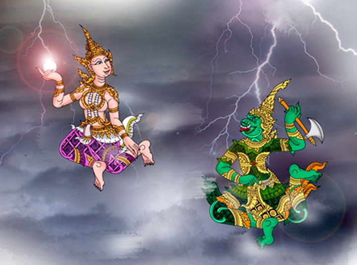 12 - Référence à la légende de Mekhala (เมขลา), la gardienne des océans, et de Ramasura (รามสูร), le géant dieu du tonnerre, armé d'une hache en diamant. Mekhala possédait un boule de cristal qui étincelait, provoquant les éclairs. Pour lui voler, Ramasura lui jetait sa hache, ce qui provoquait le tonnerre.
