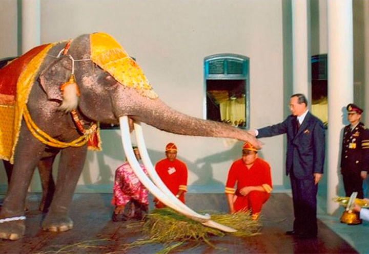 Le roi Phumiphon Adulyadej et l'un de ses éléphants royaux. ⇑