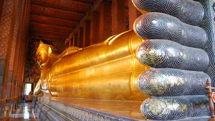 Le Bouddha couché du Wat Pho à Bangkok. ⇑