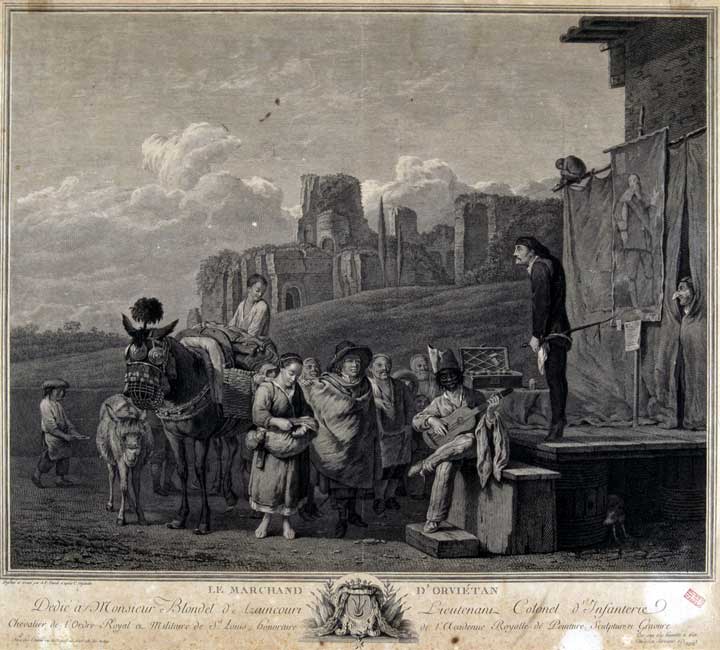 Le marchand d'orviétan. Gravure de François-Anne David. ⇑