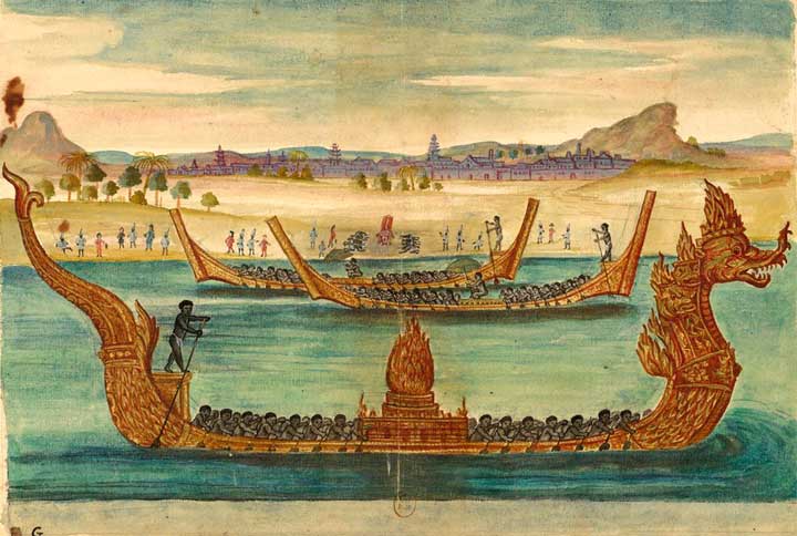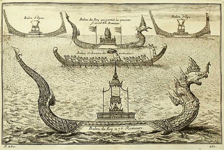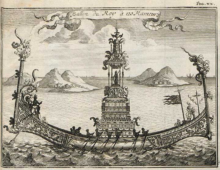 Balon du roi à 20 rameurs. Illustration du Voyage de Siam du père Tachard.