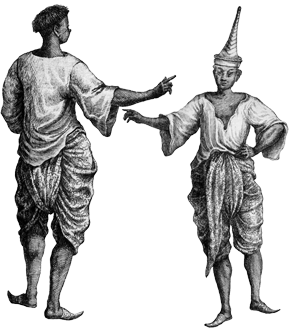 Il n'y a pas de métier dans le royaume de Siam qui soit plus ingrat que celui de tailleur, car le commun du peuple n'en a pas besoin. Tout l'habillement des hommes consiste en deux pièces d'étoffe de soie ou de coton : de l'une, qui est longue de deux aunes ou environ, et large de trois quarts, ils se couvrent les épaules en forme d'écharpe ; et de l'autre qui est de même longueur et de même largeur, ils se ceignent les reins, et la retroussant par les deux bouts fort proprement par derrière, ils s'en font une espèce de culotte qui leur pend jusqu'au dessous du genou. Ce vêtement s'appelle en siamois Pâ-nonc (1), et en langage vulgaire panne ou pagne (2) : le pagne des mandarins est bien plus ample et beaucoup plus riche que les autres. Il est ordinairement tissée d'or et d'argent, ou bien il est fait de ces belles toiles peintes des Indes qu'on appelle communément chitte (3) de Masulipatam Machilipatnam, ville côtière et port de l'Andhra Pradesh, au sud de l'Inde. ; ces messieurs portent dessous un petit pantalon de quelque belle étoffe, qui leur descend plus bas que le genou et dont les extrémités sont artistement brodées d'or et d'argent. Dans les grandes chaleurs, ils n'ont qu'une veste de mousseline faite en forme de robe de chambre qui ne passe pas leur pantalon, mais dans la saison du vent du nord, ils ont une espèce de justaucorps de brocard de la Chine ou de quelque beau drap d'Europe, qui se ferme par-devant avec dix ou douze boutons de filigrane d'or ou d'argent fort éloignés les uns des autres. Les manches qui en sont fort larges se boutonnent comme nos anciens pourpoints, et par-dessus ce justaucorps ils mettent en forme d'écharpe de nos gens de guerre une pièce de brocard d'or et d'argent, ou de toile peinte, la plus belle qu'ils peuvent trouver dans le pays.