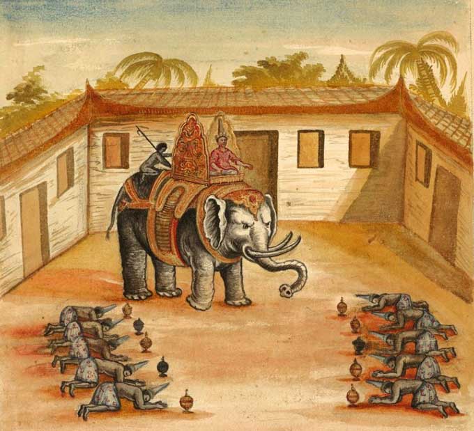 Le roi de siam sur son éléphant sortant de son palais et les mandarins de chaque côté prosternés ayant des boîtes d'or ou d'argent selon leurs dignités d'oyas ou d'opras, etc. Dessin de 1688. ⇑