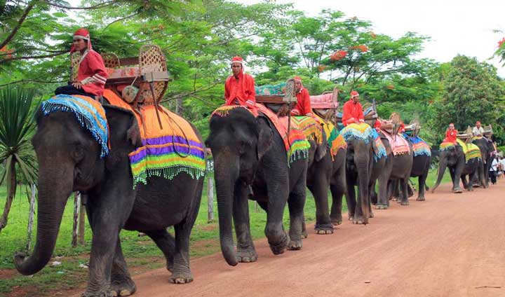 Procession traditionnelle d'éléphants dans la province de Champassak, au sud Laos. ⇑