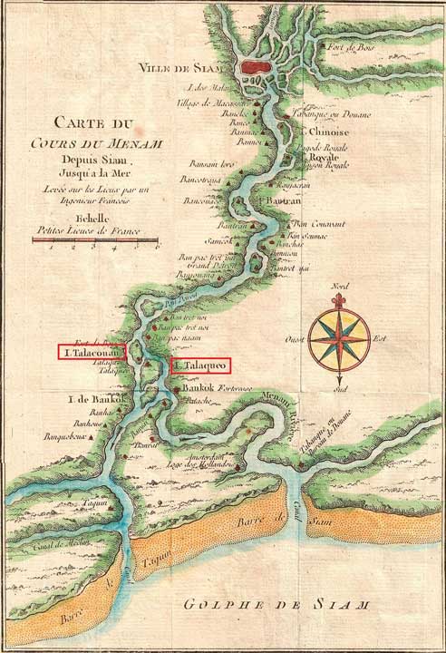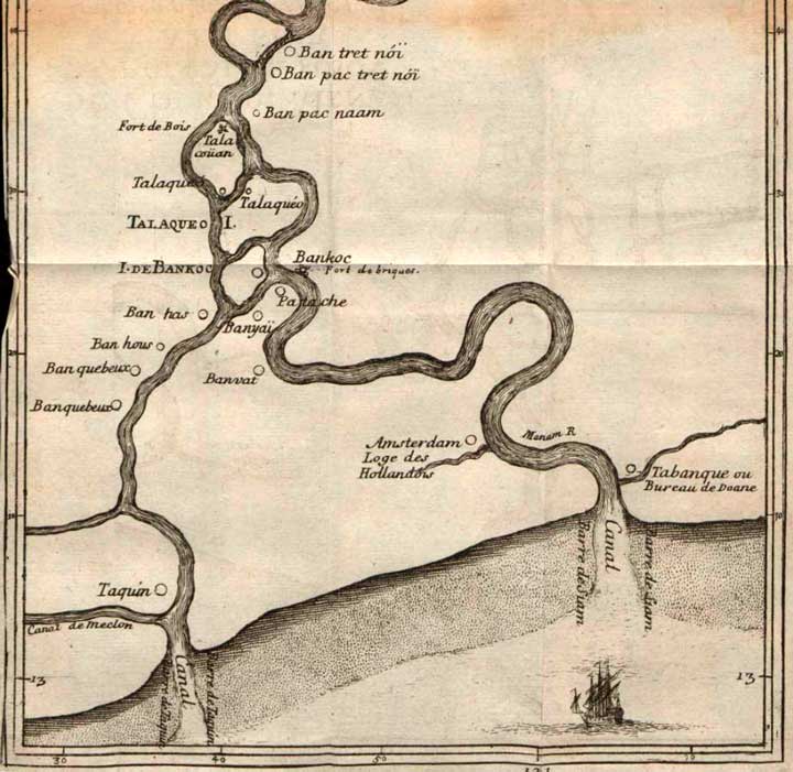 C'est sur cette rivière et à sept lieues de la mer qu'est située la ville de Bangkok (10), et je dirai en passant que les Siamois ont fort peu d'habitations sur leurs côtes, qui au moins n'en soient éloignées d'une petite journée, mais aussi elles sont presque toutes sur des rivières assez navigables pour leur donner le commerce de la mer. Quant aux noms de la plupart de ces lieux, qui par cette raison ne peuvent être appelés maritimes, ils sont déguisés par les étrangers. Ainsi la ville de Bangkok s'appelle Fon en siamois (11), sans qu'on sache d'où lui vient le nom de Bangkok (12), quoiqu'il y ait plusieurs noms siamois qui commencent par le mot de banบ้าน, qui signifie village (13).
