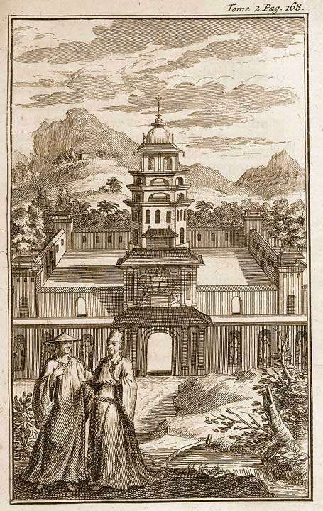 Grande pagode d'Emouy en Chine. Nouveau voyage autour du monde, 1728. ⇑