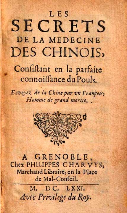 3 - La Loubère ne semble pas avoir eu connaissance d'un petit ouvrage anonyme publié à Grenoble en 1671 sous le titre Les secrets de la médecine des Chinois, consistant en la parfaite connaissance du pouls. Envoyés de la Chine par un Français, homme de grand mérite et qui eut, paraît-il un grand succès (un exemplaire conservé à la bibliothèque de la Faculté de médecine de Paris indique, surajouté sur la page de titre : Allemand, Louis-Augustin). On peut y lire : Ne soyez pas empressé ni précipité à prendre le pouls et porter aussitôt votre jugement, parce que d'un moment à l'autre il peut y avoir du changement, et plusieurs pouls ne produisent pas à l'abord, et partant, pour ne pas errer, jouer à l'assuré, il sera toujours mieux de prendre deux fois le pouls, et trois fois, s'il se peut, en temps différent, avant que porter jugement et arrêter que c'est telle chose ; que si le mal ne le permet pas, ou les personnes qui vous appellent ne vous donnent pas le loisir, laissez passer quelques intervales de temps, et après retournez prendre le pouls à votre loisir, comptant au moins 25 compas ou mesures du systole et diastole, si ce n'est que le mal fut d'abord sensible, sans donner lieu de douter de sa cause ou principe… (Avis au lecteur, n.p.)