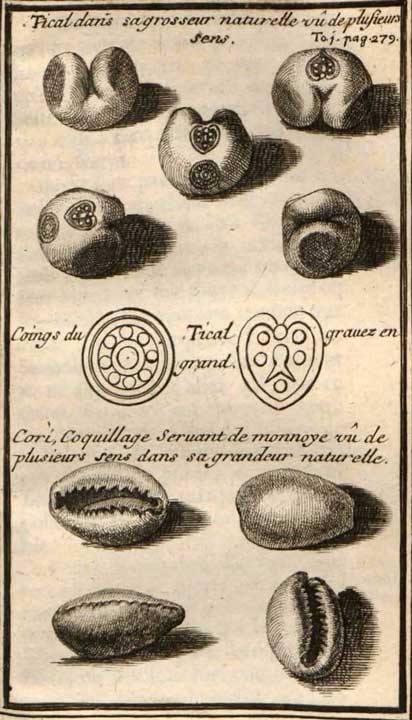 Il n'est pas aisé de dire jusqu'où s'étend l'usage de cette monnaie naturelle. Elle a cours par toute l'Inde et presque sur toutes les côtes d'Afrique, et l'on m'a dit qu'elle est reçue en quelques endroits de la Hongrie, mais j'ai de la peine à le croire parce que je ne vois pas qu'elle vaille la peine d'y en porter. Il s'en casse beaucoup dans l'usage, et à mesure qu'il y en a moins, elle vaut davantage par rapport à la monnaie d'argent, comme aussi elle baisse de prix quand il en arrive quelque charge considérable par quelque vaisseau, car c'est une sorte de marchandise. Le prix ordinaire à Siam est qu'un foüanFueang : เฟื้อง, ou la huitière partie d'un tical, vaut huit cents corís, c'est-à-dire que sept ou huit corís valent à peine un denier ; vileté de monnaie qui est une marque certaine du bon marché, ou plutôt du vil prix des denrées.