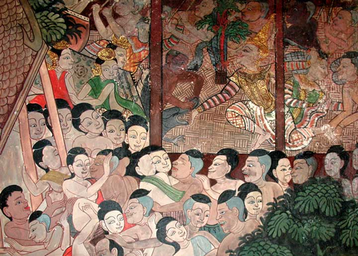 Peinture murale du wat Thong Thammachat, à Bangkok. ⇑