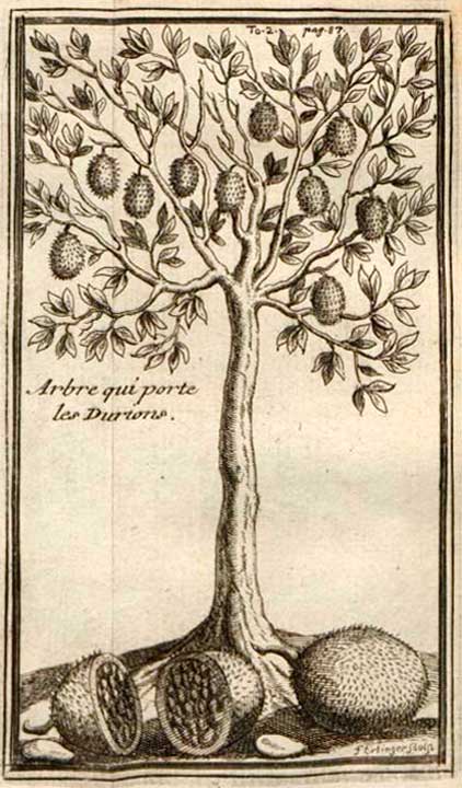 7 - Le durian (thurian : ทุเรียน), fruit du Durio zibetinus, arbre tropical de la famille des bombacées. Le missionnaire Jacques de Bourges le décrivait ainsi : … ce fruit est de la grosseur et de la figure d'un melon ordinaire. L'écorce en est dure et raboteuse, il croît au haut du tronc de l'arbre, au-dessous des branches, et parce qu'il serait difficile de l'ouvrir à cause de la dureté de son écorce, lorsqu'il est mûr, la nature a voulu qu'il s'ouvrît de lui-même par le bas en trois ou quatre endroits, on achève de le rompre avec force. On trouve dans ce fruit des morceaux d'une certaine chair tendre et délicate, enfermée en de petites cellules, cette chair égale la neige en blancheur et surpasse en la délicatesse de son goût tout ce que nous avons de meilleur en Europe, et aucun de nos fruits n'en approche. Chaque durion porte cinq, six, sept et huit de ces morceaux de chair blanche, la figure est comme celle d'une amande verte, mais quatre ou cinq fois plus grosse. Ce qui est de singulier en ce fruit merveilleux est que son odeur est fort désagréable et même insupportable d'abord qu'on la sent, ressemblant à celle d'une pomme pourrie. Ce fruit est extrêmement chaud, les Européens qui en mangent avec excès sont contraints, pour modérer l'ardeur qu'il cause, d'aller incontinent se baigner. (Relation du voyage de Monseigneur l'évêque de Bérythe […], 1668, pp. 146-147).