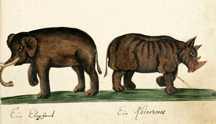 Un éléphant et un rhinocéros. Journal de voyage de Georg Franz Müller.