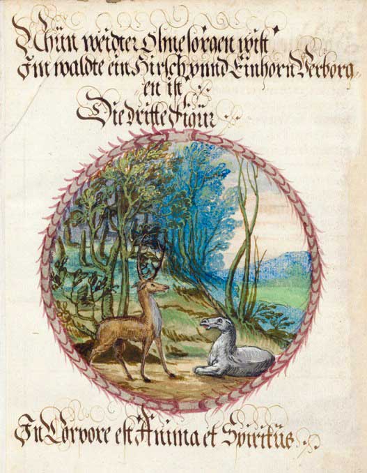 Cerf et licorne. Livre de Lambspring, 1556. Zentralbibliothek Zürich ⇑