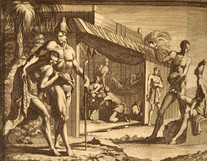 Les Péguiens portent aux parties honteuses des balles de plomb. La Galerie agréable du monde, Pieter vander AA, 1729. ⇑