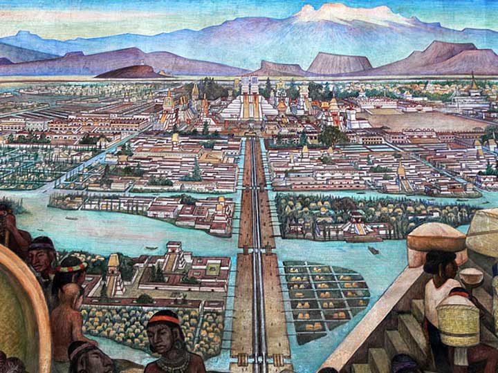 Tenochtitlán : le marché de Tlatelolco. Fresque de Diego Rivera au Palais National de Mexico (1952). ⇑