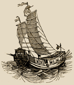 8 - Jangas, d'évidence, est une variante de junco, utilisé quelques lignes plus haut, qui désigne une jonque chinoise. Selon Dalgado (Glossário luso-asiático, II, 1919, p. 304), seró viendrait du malais seroh : retréci, réduit, ou seroq : petit. Il s'agissait donc d'une embarcation courte. Laulée est plus problématique. Henri Yule (Hobson Jobson p. 504) suggère une déformation de lantea, une sorte de bateau rapide fréquemment mentionné par Pinto et dans quelques textes anciens sur la Chine. C'est peu probable, le Memórias de arqueologia marítima portuguesa de Quirino da Fonseca (Lisbonne, 1915) énumère le Lantea ou lanteaa, distinctement du laulé ou laulee ou encore laudé. Pour Dalgado (op. cit. p. 518), le mot pourrait dériver du malais lalai ou laley, termes qui désignent des partie d'un navire. Une autre possibilité serait le malais hlay-loung : canot ou piroque. ⇑