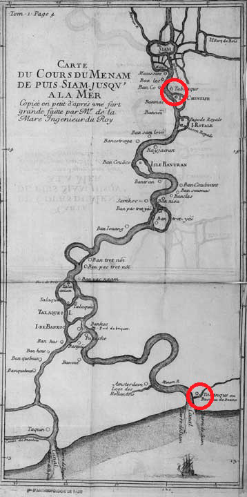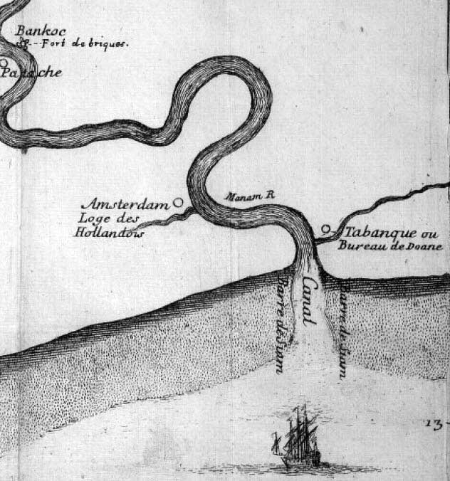 7 - Cet écueil était un banc de sable que La Loubère évoquait ainsi : Il y a devant l'embouchure du Ménam un banc de vase qu'on appelle la Barre en termes de marine, et qui en défend l'entrée aux grands vaisseaux. Il y a apparence qu'il s'augmentera peu à peu, et qu'il donnera avec le temps à la terre ferme un nouveau rivage. (Du royaume de Siam, 1691, I, pp. 52-53).