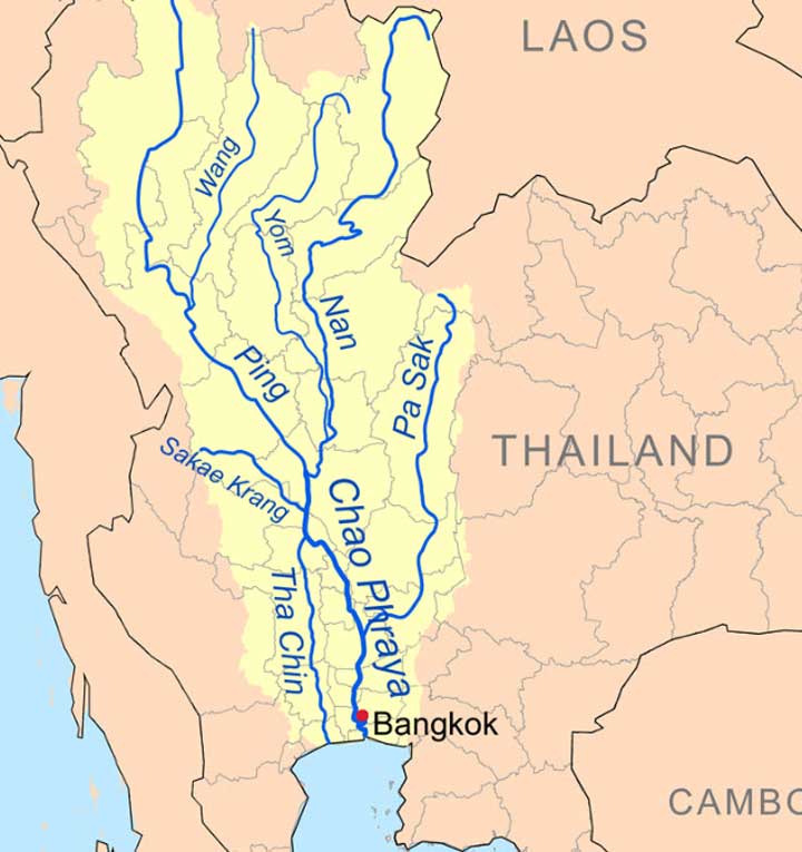 5 - Ménam (แม่น้ำ) est un nom générique qui désigne les fleuves et les rivières en général. Le fleuve qui arrose Ayutthaya est la Ménam Chao Phraya (แม่น้ำเจ้าพระยา). ⇑