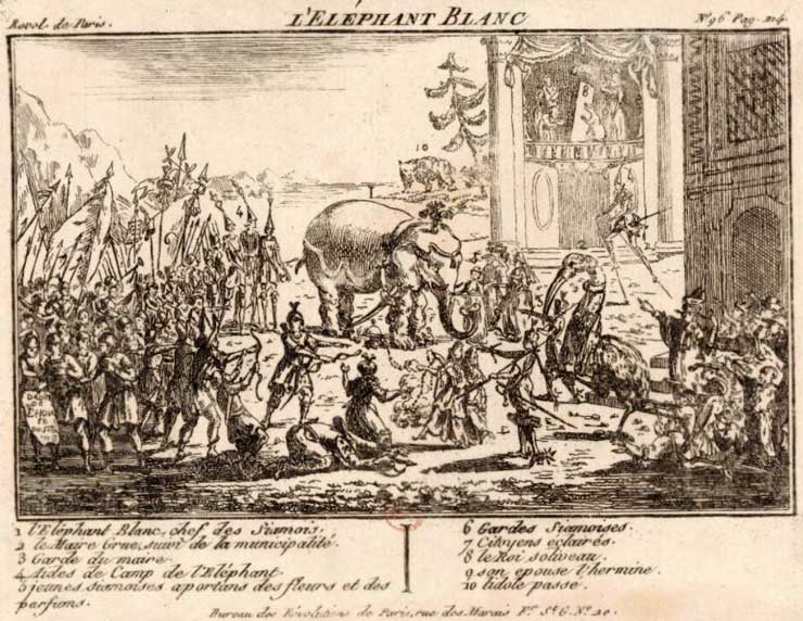 L'éléphant blanc, gravure satirique, 1791. ⇑