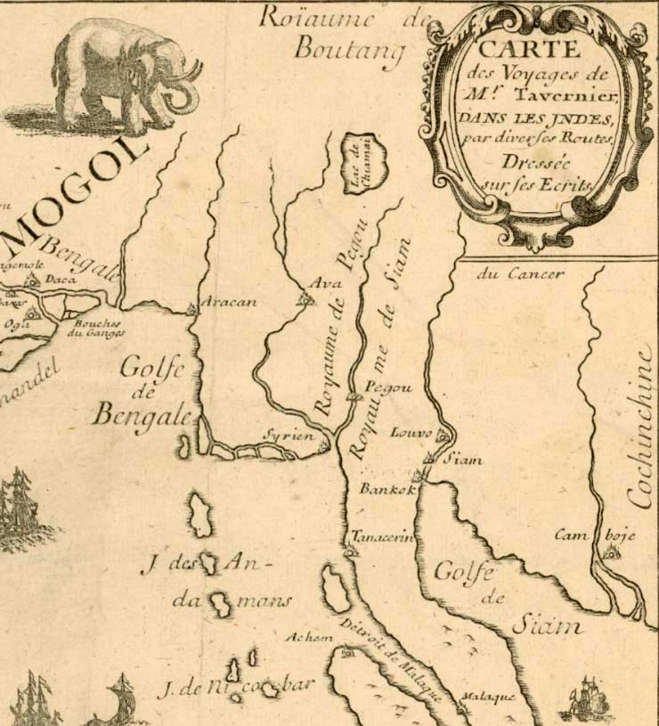 2 - Denoncerim désignait Ténasserim, aujourd'hui en Birmanie. Tavernier répertoriait inlassablement toutes les routes possibles pour sillonner les pays qu'il traversait. Dans la première partie de ses voyages, les titres des chapitres sont éloquents à ce sujet : Des diverses routes qu'on peut tenir pour se rendre de Paris à Ispahan, par les provinces septentrionales de la Turquie ou encore Des diverses routes qu'on peut tenir pour se rendre de Paris à Ispahan, par les provinces méridionales de la Turquie et par le désert, il semble que pas une voie n'ait échappé à sa frénésie d'exploration...