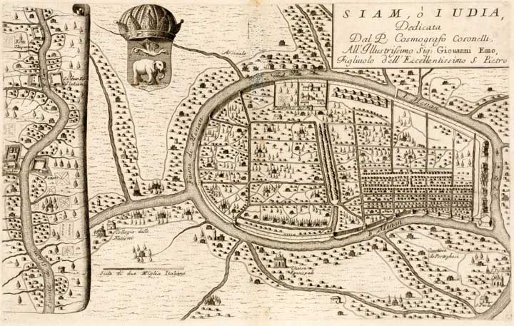 Siam, ville capitale du royaume et la résidence ordinaire du roi est ceinte de murailles et a plus de trois de nos lieues de circuit. Elle est dans une île de la rivière l'embrassant de tous côtés, et l'on pourrait aisément conduire des canaux par toutes les rues, si le roi voulait employer pour cet ouvrage une partie de tant d'or qu'il consume pour les temples de ses idoles (9).
