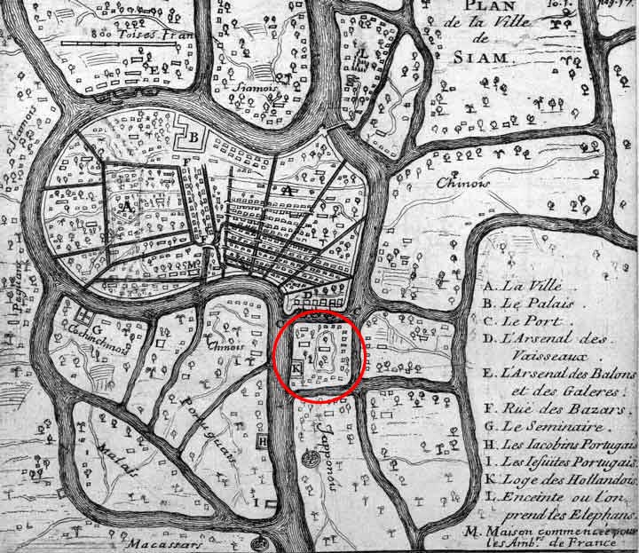 L'an 1665 il y avait dans la ville de Siam un jésuite napolitain qui s'appelait le père Thomas. Il faisait fortifier la ville et le palais du roi qui est sur le bord de la rivière, et il avait déjà fait faire de côté et d'autre de bons bastions. Ce fut en cette considération que le roi lui permit de demeurer dans la ville, où il a une petite église avec une maison, où M. Lambert évêque de Bérythe fut loger en arrivant à Siam. Mais ils ne furent pas longtemps bien d'accord ensemble, et M. l'évêque trouva à propos d'avoir sa chapelle à part.