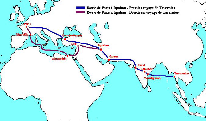 Les trajets de Paris à Ténasserim décrits par Tavernier. ⇑