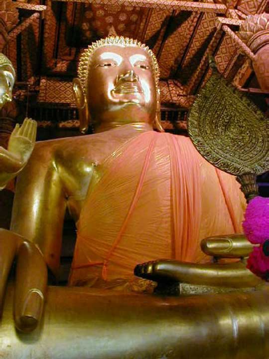 16 - Peut-être s'agit-il du Wat Phra Phuttha Saiyat (พระพุทธไสยาสน์), également appelé Wat Pa Mok (วัดป่าโมก, littéralement, le Temple de la forêt de jasmin), au sud d'Ang Thong. Ce wat abrite un bouddha couché de 22,6 mètres qui date du XVe siècle. ⇑