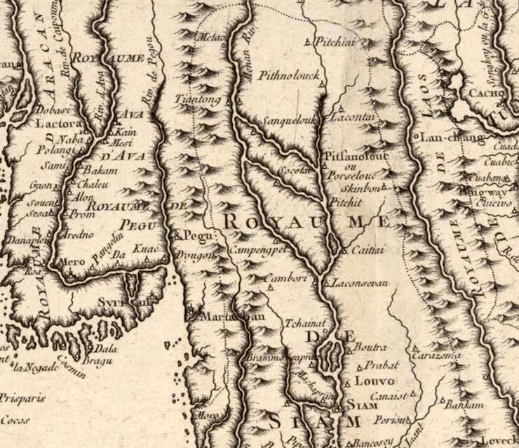 Royaumes d'Aracan, de Pegu, d'Ava, de Siam, etc. Détail d'une carte du XVIIIe siècle. ⇑