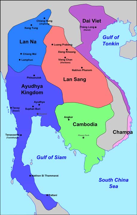 Le Lan Chang (Lan Sang) et les royaumes voisins vers 1540. (Wikipédia). ⇑