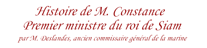 Si l'Histoire de M. Constance du père d'Orléans n'est effectivement qu'une compilation très partiale d'écrits dus aux jésuites, et principalement aux pères Tachard et de Bèze, on peut également mettre en doute la pureté et la valeur historique des sources utilisées par André-François Deslandes. Certes, de par sa situation géographique, Pondichéry était une plaque tournante importante du commerce dans les Indes, où se croisaient vaisseaux en partance pour Bangkok, Mergui ou Ténassérim et vaisseaux qui en revenaient, et où s'échangeaient des multitudes d'informations (mais aussi de rumeurs et de fausses nouvelles), toutefois François Martin, son gouverneur, n'avait jamais mis lui-même les pieds au Siam et n'avait connu Phaulkon qu'à travers les témoignages qu'il en recueillait. Quant à André Deslandes, le père de l'auteur, il n'était plus au Siam lors du coup d'État de 1688. Arrivé dans le royaume en 1680, il en était parti en 1684, et il semble qu'il ait entretenu pendant son séjour d'excellents rapports avec M. Constance. C'est ce que laisse entendre une lettre du 26 décembre 1682 adressée à François Baron, directeur général de la Compagnie à Surate (Histoire de la Mission de Siam, 1920, I, p. 123) : Il y a ici un mandarin que le roi a même élevé à la dignité d'Opra, qui est la seconde du royaume ; il s'appelle Constantin Phaulkon, natif de Céphalonie. (…) Cet honnête homme est d'un esprit vif, agissant et pénétrant, ce qui l'a fait monter à un tel point de faveur, depuis deux ans qu'il s'est engagé au service du roi, qu'on le nomme présentement en riant le second barcalon. Il fait plus de négoce que tout le reste des marchands particuliers ensemble, va deux fois le jour à l'audience du roi, et le prince qui se plaît à sa conversation et est curieux, se fait souvent entretenir des deux et trois heures d'horloge par ce mandarin. Vous pouvez juger de quelle utilité l'amitié d'un tel homme nous peut-être, puisqu'on ne peut rien faire savoir au roi de ce qu'on souhaite que par le moyen de quelque personne affidée. J'ai fait une amitié très particulière avec lui, et j'ai aussi aidé à l'engager au service de Mgrs de telle manière qu'ils ne font rien et ne demandent rien que par son avis et par son moyen. Et comme nos entretiens sont ordinairement sur les grandes actions de notre invincible monarque, duquel il conserve le portrait et plusieurs estampes dans les lieux les plus éminents de sa maison, il est certain qu'il donne à ce prince des idées si grandes de notre grand roi qu'il n'y a rien à y ajouter. Quand ici je vais visiter le barcalon, il me fait toujours compagnie ainsi qu'à Monseigneur, et nous reconnaissons sensiblement, par les succès, le crédit qu'il a et l'affection avec laquelle il sert. Quoique je m'étende beaucoup sur cet article, je ne peux cependant vous marquer le quart de ce que je souhaiterais à son égard.