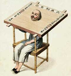 On en mit d'abord en prison un très grand nombre de toutes nations, de toutes conditions, et de tous âges, et cette prison seule pouvait passer pour un grand supplice. C'était des enceintes de pieux, exposées à toutes les injures de l'air (2), où l'on arrangeait sur deux lignes vingt-cinq ou trente personnes, la cangueInstrument de torture portatif, d'origine chinoise, ayant la forme d'une planche ou d'une table percée de trois trous dans lesquels on introduisait la tête et les mains du supplicié.