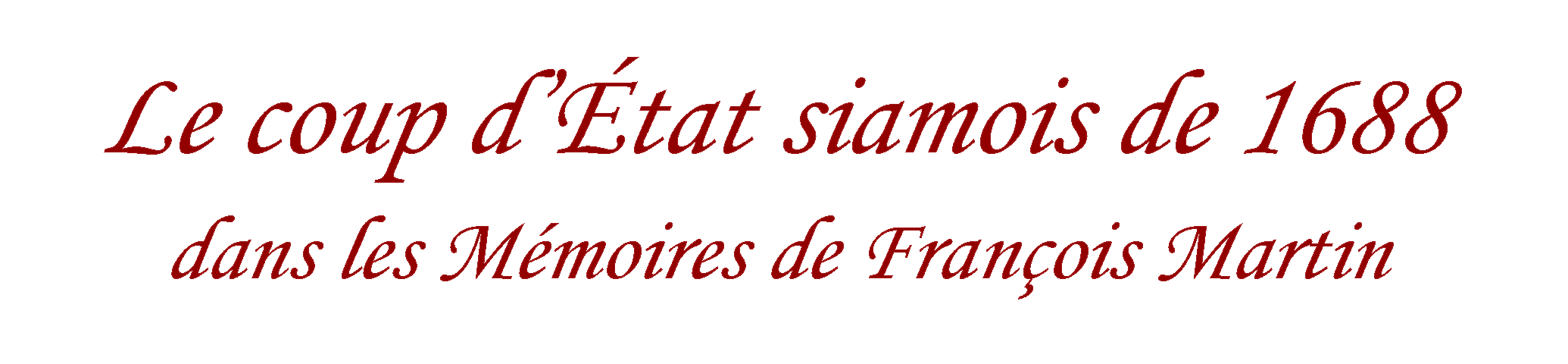 6 - Le 6 février 1689. l'Abrégé de ce qui s'est passé à Bangkok pendant le siège de 1688 (A.N. Col. C1/24 f° 169r°) indique une date postérieure au 12 février et mentionne comme participants à ce conseil : Desfarges, du Bruant, Vertesalle, le commissaire de La Salle, Courcelles, Beauchamp, Lamare, Véret et de l'Estrille. ⇑