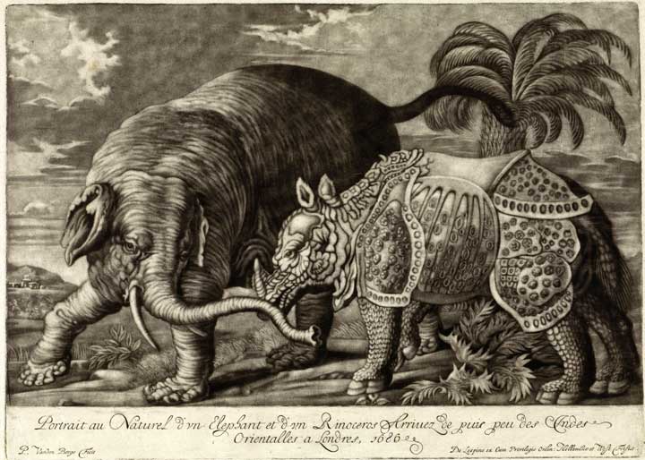 Rhinocéros et éléphant. Gravure de Jan Griffier. Rijksmuseum.