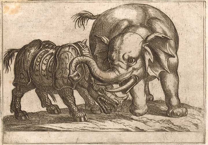 Combat d'un éléphant et d'un rhinocéros. Antonio Tempesta, 1600. Rijksmuseum. ⇑