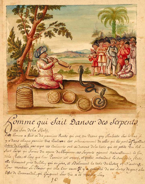 Homme qui fait danser des serpents. Dessin colorié anonyme, 1688.