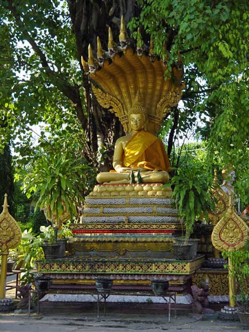 Dans la mythologie bouddhiste, le cobra a inspiré le naga (nak : นาก), figure tutélaire très souvent représentée dans les temples et dans l'iconographie. Hommage à Muchalinda (มุจลินท์), le roi des nagas, qui a déployé son capuchon au-dessus de la tête de Bouddha pour le protéger de la pluie.