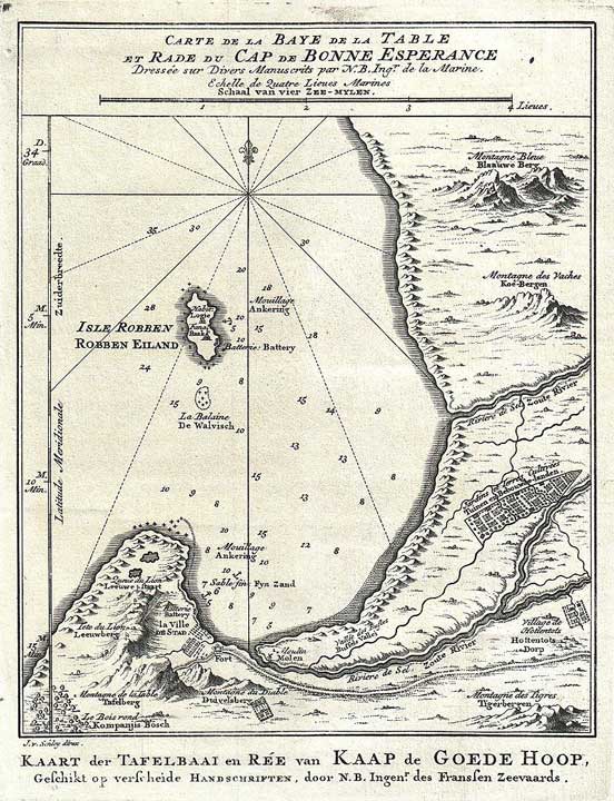 Le cap de Bonne-Espérance. La rade de la Table et l'île Robben (carte de 1773). ⇑