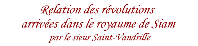La relation présentée ici a été rédigée, comme plusieurs autres, dans la prison de Middelbourg, en Hollande, où furent transférés les Français des navires le Coche et la Normande qui avaient été capturés au début de mai 1689 lors de leur escale au cap de Bonne-Espérance, ignorant que la guerre contre la Ligue d'Augsbourg avait été déclarée le 26 novembre 1688 et que les Hollandais étaient officiellement redevenus des ennemis. Dans son préambule, Saint-Vandrille nous apprend qu'il essayait de reconstituer une relation destinée à M. de Seignelay qui lui avait été confiée par son oncle, M. d'Alvimare (sans doute resté à Pondichéry avec Desfarges et ayant participé à l'expédition de Phuket) et qui avait été perdue ou saisie par les Hollandais au cap de Bonne-Espérance. De la part d'un acteur des événements, c'est donc un document de première main, sincère et fidèle, qui se devait de figurer dans ce chapitre. Nous en avons revu l'orthographe et la ponctuation, nous l'avons divisé en deux parties pour faciliter le chargement des pages, et nous avons tâché de l'éclairer par quelques notes.