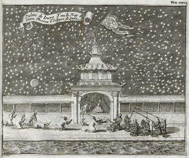 Elle fut spéculée par les missionnaires jésuites et mathématiciens envoyés par le roi aux Indes orientales en 1687. Ce fut à Louvo dans le palais du roi qu'on l'observa en présence de ce prince qui était à une fenêtre d'une grande salle de son palais, assis sur un fauteuil, et les jésuites avec M. Constance qui leur servait d'interprète était assis les pieds croisés sur un grand tapis où était une rangée de mandarins prosternés la tête contre terre des deux côtés. On se servait en cette occasion de la belle machine parallactique qui est une espèce d'horloge où est attachée une lunette d'approche qui suit le mouvement du soleil. L'on voit là le mandarin Opra Pitracha qui vint voir de près cette machine. C'est celui qui s'est emparé du royaume de Siam et a chassé les Français. (Bibliothèque Nationale, Paris, Cabinet des Estampes). ⇑