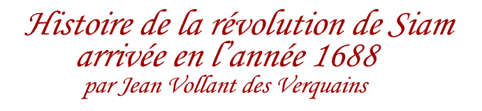 4 - Il y avait peu de Français qui n'aient reçu quelque faveur de Phaulkon, et Sainte-Marie ne faisait sans doute pas exception à la règle. Le père Le Blanc le confirme : Cet officier, écrit-il, qui avait obligation à feu M. Constance, en fut plus reconnaissant que plusieurs autres qui lui en avaient davantage. (Histoire de la révolution [...], 1692, II, p.55). Allusion à peine voilée à Desfarges. ⇑